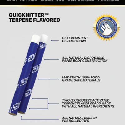 The Quick Hitter Is The Perfect Solution For The Avid User Who Cannot Always Travel With Their Coveted Glass Pieces. Available In Packs Of 2, Quick Hitters Are Multipurpose One Hitters That Have A Squeeze Activated Flavor With Real Fruit Terpenes Ranging From Banana, Blueberry, Mango, Watermelon And Grape. Just Squeeze The End Until You Hear A Pop To Release The Flavor.