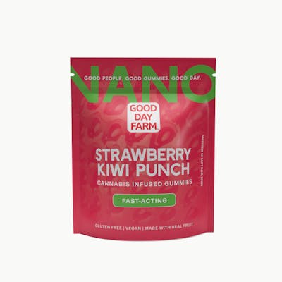 Good Day Farm Strawberry Kiwi Punch NANO Gummies provide fast-acting and consistent results! Our proprietary GDF7 Nano technology creates water soluble cannabinoids for faster absorption into the bloodstream. The result is a sweet and sour gummy with an activation time of 0-15 minutes. 10mg THC per piece | Activation time: 0-15 min | Melt-Proof, Gluten-Free, Vegan, Made with Real Fruit Good People. Good Gummies. Good Day.