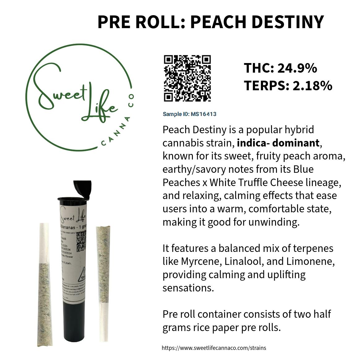 Lucky Sevens has seven half gram pre rolls containing Peach Destiny whole flower. She is a popular hybrid cannabis strain, indica- dominant, known for its sweet, fruity peach aroma, earthy/savory notes from its Blue Peaches x White Truffle Cheese lineage, and relaxing, calming effects that ease users into a warm, comfortable state, making it good for unwinding. It features a balanced mix of terpenes like Myrcene, Linalool, and Limonene, providing calming and uplifting sensations. Pre rolls are made locally in Long beach, MS and are made of rice paper.