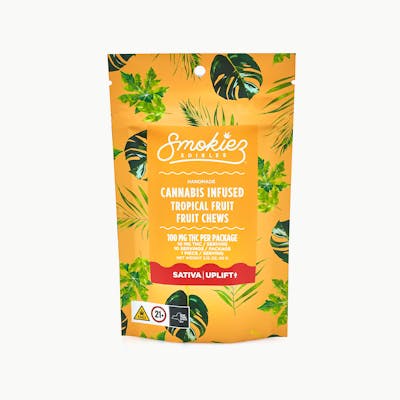 Smokiez Tropical Fruit Sativa Chews | 100mg THC Infused with real cannabis-derived terpenes, Smokiez Tropical Fruit Chews offer a bright, uplifting experience paired with the vibrant flavor of ripe tropical fruits. Each piece delivers a smooth blend of sweetness and citrusy complexity, capturing the essence of sun-soaked islands in every bite. Formulated with 10mg of THC per chew and made using high-clarity cannabis distillate, these sativa-enhanced edibles are ideal for enhancing mood, focus, and creative energy throughout the day. Discreet, delicious, and precisely dosed, they offer a consistent and sophisticated way to elevate your daily rhythm. Smokiez chews are vegan, gluten-free, dairy-free, and free of high-fructose corn syrup—crafted for those who value both wellness and taste. Each package contains 10 chews, totaling 100mg THC.
