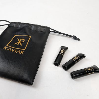 Elevate your smoking experience with "Just the Tip," a set of three hand-blown black glass joint tips meticulously crafted to enhance both style and functionality. These joint tips proudly bear the Kaviar Gold brand and come packaged in a branded leather bag, adding a touch of luxury to your smoking ritual. Features: Kaviar Branded Craftsmanship: Each black glass joint tip is individually hand-blown, ensuring its uniqueness and quality, with the Kaviar Gold brand prominently featured for authenticity. Enhanced Flavor and Smoothness: "Just the Tip" not only provides a stylish appearance but also improves the taste and smoothness of your smoke, making each session more enjoyable. Easy to Clean: Glass is easy to clean, ensuring that your Kaviar Gold-branded joint tips maintain their clarity and performance, session after session. Branded Leather Bag: Our set of three "Just the Tip" joint tips comes elegantly packaged in a branded leather bag, adding a touch of sophistication to your smoking accessories collection. Perfect Gift: Whether you're treating yourself or looking for an exceptional gift for a fellow connoisseur, "Just the Tip" hand-blown black glass joint tips make for a thoughtful and stylish choice. Enhance your smoking experience with "Just the Tip," a luxurious and sophisticated set of hand-blown black glass joint tips that proudly bear the Kaviar Gold brand. Elevate your sessions and enjoy the enhanced flavor and smoothness that only glass can provide. Keep them organized and protected in the branded leather bag, making a statement with every use.