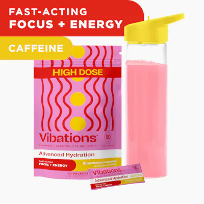 Berry bold and tasty, with a tart finish, our hydrating Strawberry Lemonade mix will give your on-the-go a little more go. Focus and energize with a kick of THC, electrolytes, l-theanine, and natural caffeine from guarana. Focus and energize your day with Vibations: Advanced Hydration. Our great tasting cannabis + electrolyte drink mix is infused with fast-acting, full-spectrum cannabis, optimized cannabinoids, and natural ingredients so you can vibe your way into your best day.