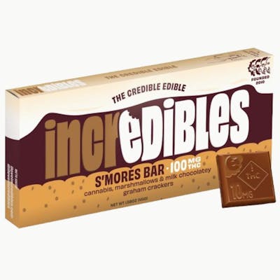 Incredibles S'mores chocolate bar will have you wanting some more. Get fired up with this gooey goodness - Marshmallows, milk chocolate graham cracker, happy campers. Contains 10 pieces, 10mg THC each.