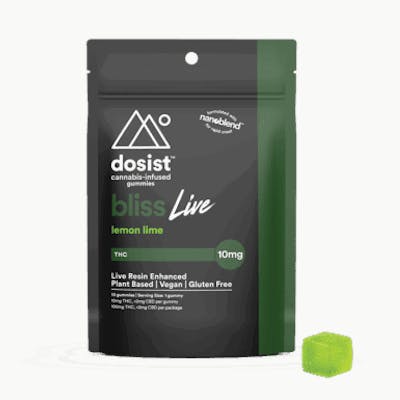 Bliss by Dosist is a THC- forward formula designed to help you feel just the right amount of good. The Dosist Bliss gummy contains 10mg of THC and is made with natural lemon-lime citrus flavors. Live Resin Enhanced, plant based, vegan, and gluten free. Formulated with nanoblend for rapid onset. Ingredients: Tapioca syrup, IMO syrup, cane sugar, pectin, citric acid, cannabis extract, MCT (coconut) oil, apricot kernel esters, ascorbic acid, natural lemon and lime flavor, turmeric extract.
