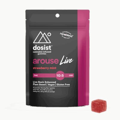 Arouse by Dosist is a 10:5 mg THC to CBD ration formula designed to awaken your senses and stimulate your mind and body. The Dosist arouse gummy contains 10mg of THC and 5mg of CBD is made with natural strawberry and mint flavors. Live Resin Enhanced, plant based, vegan, and gluten free. Formulated with nanoblend for rapid onset. Ingredients: Tapioca syrup, cane sugar, pectin, citric acid, cannabis extract, strawberry extract, mint extract, natural flavors, beet juice, sunflower oil, MCT (coconut) oil, apricot kernel esters.