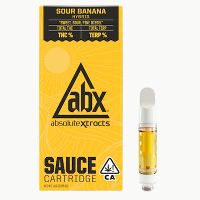 This 1g Sauce Cartridge from ABX (AbsoluteXtracts) features Sour Banana, a sophisticated and balanced selection known for its unique aromatic profile. A masterful cross of Sour Diesel and Banana Sherbet, this premium sauce delivers a complex sensory experience defined by overripe tropical fruit and sharp citrus, layered over notes of earthy musk, pungent gas, and a smooth, peppery exhale.