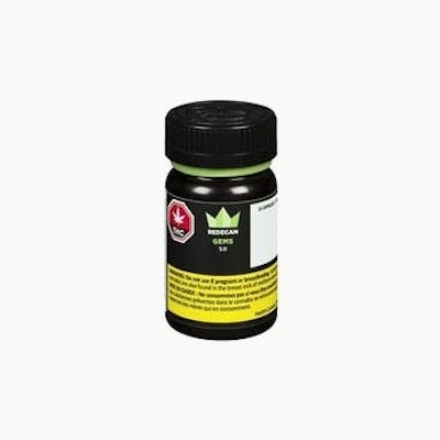 Grown in Niagara, Ont., Gems 5:0 cannabis softgels are made with ethanol-extracted oil from greenhouse-grown, blended hybrid strains. Each gelatin softgel has 4-6 mg of THC, no CBD and was formulated with MCT oil. They have mild THC potency and are available in 15-capsule bottles.