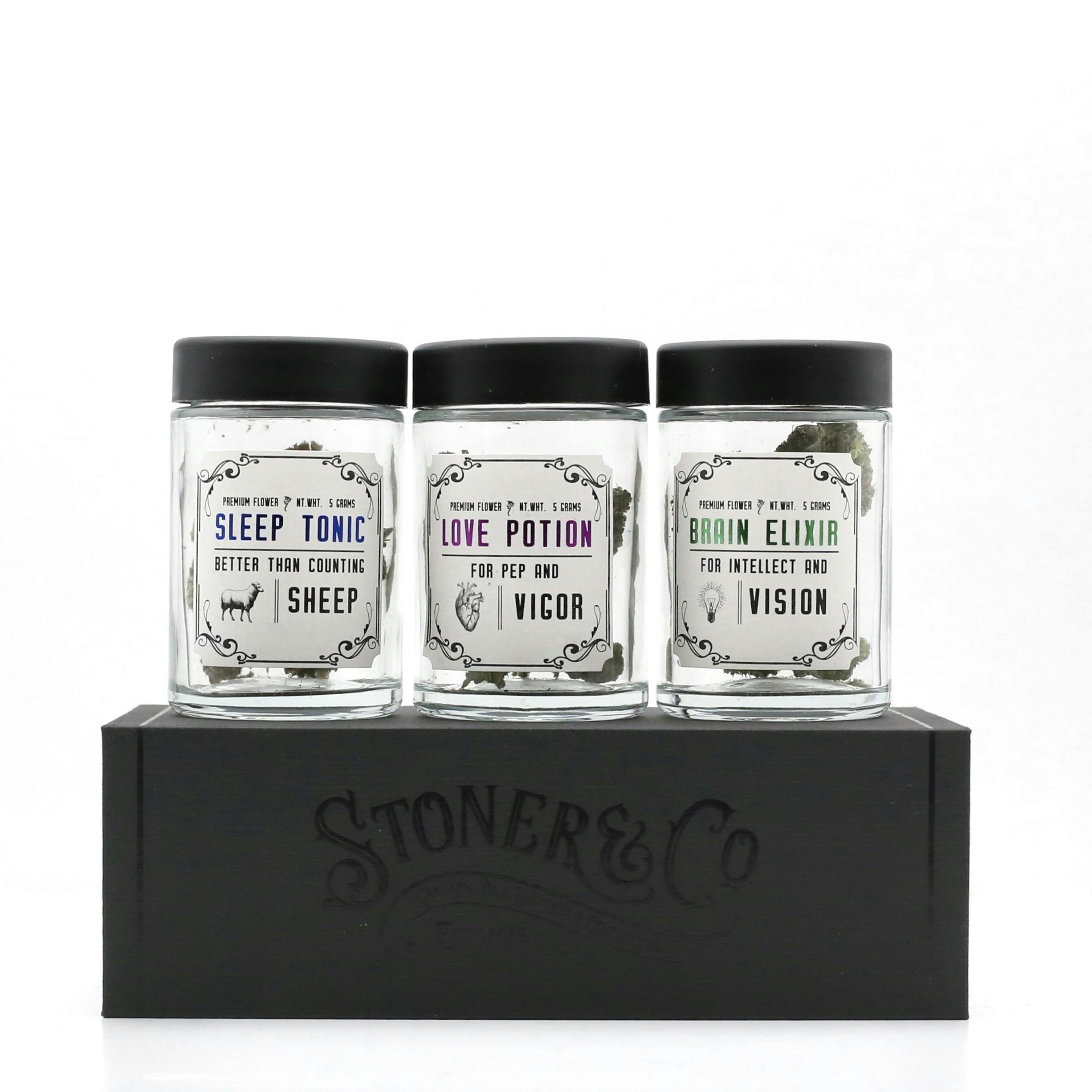 Stoner&Co's infamous Apothecary Trio is a perfect gift. We rotate our favorite strains in three categories and create a balanced set for you to enjoy: Brain, Love, and Sleep. Each of the gift boxes contains three, 5 gram jars of premium cannabis flower.