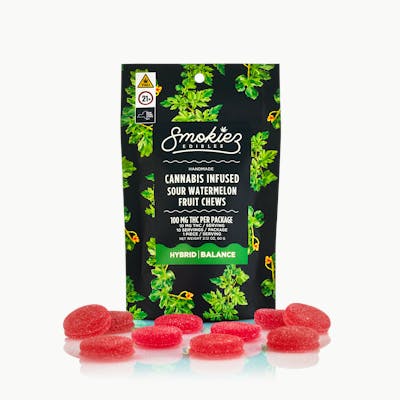 Our best-selling flavor, Smokiez Sour Watermelon Fruit Chews are NOT YOUR AVERAGE FRUIT CHEWS™ ;) These fruit chews taste like a tart and juicy watermelon, with a balance of fruity and citrusy notes. These delicious fruit chews are a tasty and discreet way for you to indulge! They are also made with plant-based ingredients, dairy-free, and contain NO high fructose corn syrup. Each of our mouth watering fruit chews contain 10 mg of THC, and made with our high clarity cannabis distillate for great taste. There are 10 pieces per package with 100 mg active THC per package. Smokiez 100mg THC Fruit Chews come in 3 delicious flavors and have both sweet and sour flavor profiles