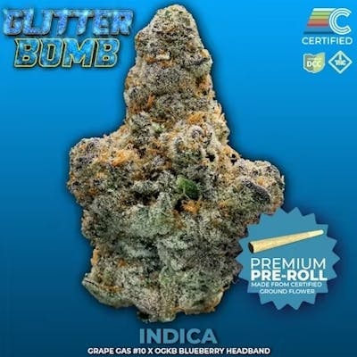 ABOUT: Nug-Run, Premium Pre Rolls; made from CERTIFIED grown genetics. We meticulously grind strain-specific nugs in-house and pack each unit by hand. — ~24.1% THC PRIMARY TERPENE: Myrcene | Caryophyllene | Linalool SECONDARY TERPENES: Humulene | Limonene (based on an average of test results; may vary batch-to-batch) — DESCRIPTION: Glitter Bomb (Grape Gas #10 × OGKB Blueberry Headband), bred by Compound Genetics and NorCal Genetics, lives up to its name with resin-soaked, color-shifting buds that flash deep purples and blues beneath bright orange pistils. The dominant Myrcene delivers a ripe, jammy foundation of dark berries and musky earth, while Caryophyllene adds warmth and spice to the savory edge. Linalool and Ocimene introduce subtle floral and fruity layers, with Limonene and Humulene bringing a final touch of citrus zest and herbal dryness. Visually striking and aromatically bold, Glitter Bomb is a full-sensory experience—dense, flavorful, and deeply satisfying. — LINEAGE: Grape Gas #10 x OGKB Blueberry Headband CATEGORY: Indica BREEDER: Compund Genetics x NorCal Genetics AROMA: Savory and rich with layers of blueberry, grape, and earthy funk. — OUR GENETICS: Choice genetics are hand-selected for unique cannabinoid/terpene profiles - as well as benefited conditions – to provide Ohio patients with a curated selection of quality medical cultivars. — WHO WE ARE: We are family-owned, operated, and based out of Dayton, Ohio. Our facility has hosted family businesses for three generations. From auto parts to sushi and now medical cannabis. We pride ourselves on our passion for high quality, science, and design to create an exceptional medical cannabis experience.