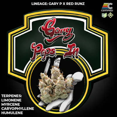 Formerly called Gary Rntz, this is a fruity and sugar-centric flavor profile. Gary Pops In, formerly Gary Rntz #2, (Gary P × Red Runz), is a high-THC standout with a loud and playful aromatic profile. Dominant Limonene and Myrcene bring citrus brightness and juicy fruit character, while Caryophyllene adds a warm, peppery base. Supporting terpenes like Humulene, Guaiol, and Beta-Pinene introduce subtle herbal, woody, and slightly piney notes, giving this sugar-gas strain a bit of depth beneath its sugary surface. It's an attention-grabbing cultivar that blends sweet and sour with serious potency—flavorful, gassy, and ready to make an entrance. LINEAGE: Gary P x Red Runz CATEGORY: Hybrid BREEDER: Exotic Genetix AROMA: A sweet, fruit-forward profile with bright gas and a tangy edge. PRIMARY TERPENES: Limonene | Myrcene SECONDARY TERPENES: Caryophyllene | Guaiol | Humulene
