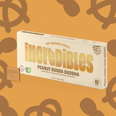 Enlighten your tastebuds with this bite of heaven. Savory pretzels, chocolatey peanut butter, blissful well-being. Incredibles Peanut Budda Buddha bar offers 100mg THC total, with 10mg THC per square. Made with pure THC distillate in a homogeneous mixture to ensure accurate dosing and consistency.