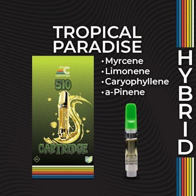 AROMA: Bright citrus and tropical fruit from Limonene and Valencene; Creamy depth from Myrcene; Spiced richness from Caryophyllene; Floral and herbal finish from Linalool and Bisabolol. DESCRIPTION: Tropical Paradise is a vivid, fruit-forward sativa with a lush terpene profile that radiates sunshine. Dominant Limonene and Valencene bring sparkling citrus notes of lemon, lime, and wild berries, while high Myrcene adds a creamy, sweet foundation reminiscent of sugared fruit and soft dessert. Supporting terpenes like Caryophyllene and Humulene introduce a subtle earthy spice, while Alpha- and Beta-Pinene deliver herbal lift and piney sharpness. Linalool and Bisabolol round out the bouquet with a gentle floral smoothness. The result is an aromatic experience that blends citrus zest with candy-like fruit and creamy undertones—a bright, breezy profile that’s both uplifting and comforting. EFFECTS: An energizing and euphoric sativa layered with creamy citrus and wild fruit notes—supported by mellow, creative undertones that make it ideal for daytime inspiration or evening ease.