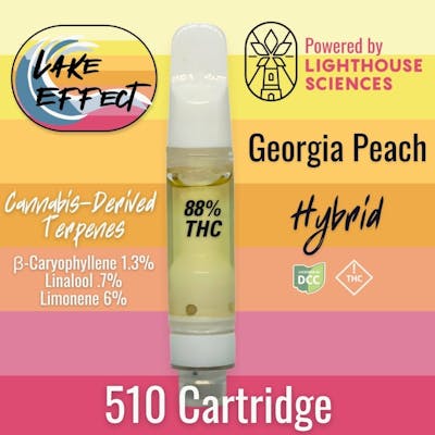 Georgia Peach is a hybrid profile built around a smooth, fruit-forward cannabis character with a rounded foundation. ß-caryophyllene leads the profile, providing depth and structure, while linalool introduces a softer layer underneath. A light touch of limonene adds brightness on the front end, giving the profile a familiar, well-paced feel without becoming overpowering. Powered by Lighthouse Sciences, Lake Effect 510 cartridges are formulated with cannabis-derived terpenes and a lab-driven approach focused on consistency, clarity, and thoughtful formulation. Each cartridge is crafted to deliver smooth vapor and reliable performance, emphasizing quality and precision without unnecessary complexity.