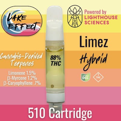 Limez is a hybrid profile defined by a bright, citrus-forward character that leans fresh and fruit-focused in classic cannabis terms. The profile opens with a clean lime-adjacent note led by limonene, followed by a softer, rounded layer from myrcene. ß-caryophyllene adds a touch of depth underneath, giving the overall profile shape without weighing it down. The result reads lively and approachable, with a citrus presence that stays natural and restrained rather than overpowering. Powered by Lighthouse Sciences, Lake Effect 510 cartridges are formulated with cannabis-derived terpenes and a lab-driven approach focused on consistency, clarity, and thoughtful formulation. Each cartridge is crafted to deliver smooth vapor and reliable performance, emphasizing quality and precision without unnecessary complexity.