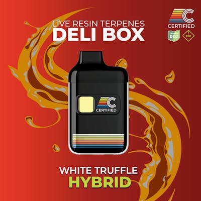 From our LOUD Series, the Deli Box [Variable Voltage] Disposable made with Live Resin Terpenes (LRT)! — 2 button clicks: Pre-Heat feature 3 button clicks: Variable Voltage (Low: 2.6V; High: 2.8V) 5 button clicks: turn on/off — AROMA: Earthy musk and hazy funk from Terpinolene and Myrcene; Subtle citrus brightness from Limonene and Ocimene; Forest-like freshness from Alpha- and Beta-Pinene; Spiced depth from Caryophyllene; Sharp herbal edge from Carene. DESCRIPTION: White Truffle, a savory-sweet hybrid cross of Peanut Butter Breath and GG4, showcases a rich and funky aromatic profile. Leading with high Terpinolene and Myrcene, it delivers an earthy haze layered with musky depth and sweet funk. Ocimene and Limonene introduce soft citrus notes that brighten the backend, while Alpha- and Beta-Pinene contribute a sharp, piney freshness. Caryophyllene and Carene round out the experience with a warm, herbal finish. This complex blend offers a full-bodied profile that balances sweetness, spice, and forest-like funk. EFFECTS: A rich and grounded hybrid with funky depth and bright citrus lift—perfect for centering the mind while keeping the senses alert. — ~6.64 - 8.08% TOTAL TERPENES PRIMARY TERPENES: Terpinolene | Myrcene SECONDARY TERPENES: Ocimene | Limonene | a-Pinene | b-Pinene | Caryophyllene | Carene | Bisabolol (based on an average of test results; may vary batch-to-batch) — ABOUT: These smell loud - they are not discreet. These all-in-one vape pens are designed to create a cannabis-centric experience, with the associated taste and smells. We carefully source high-quality and flavorful Live Resin terpenes to provide classic strains in a convenient vape format. — DELI BOX HARDWARE: Packaged in a Cilicon Deli Box Disposable & Rechargeable All-in-One with Variable Voltage. • No Heavy Metals • Equipped with the next-gen ceramic cool-heating technology – DeliFlow™ • Innovative postless design makes it completely metal-free and cotton-free while providing a clear visual into oil level • Consistent vapor production without leaking or clogging • Flavorful & Smooth Hits **USB-C charging**