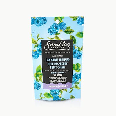 Indica Blue Raspberry 100mg THC Fruit Chews Enhanced with real cannabis terpenes! Smokiez Blue Raspberry Fruit Chews are NOT YOUR AVERAGE FRUIT CHEWS™ These delicious fruit chews are a tasty and satisfying way for you to medicate! They are also Vegan, Gluten Free, Dairy-Free, and contain NO High Fructose Corn Syrup. Each of our mouth watering fruit chews contain 10 mg of THC, and made with our high clarity cannabis distillate for great taste. There are 10 pieces per package with 100 mg active THC per package. Smokiez Fruit Chews come in 5 delicious flavors and have both sweet and sour flavor profiles
