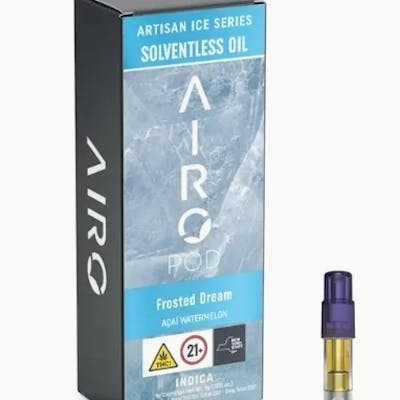Escape into a cooler state of mind with Artisan Ice Series Frosted Dream by Airo Brands. Frosted Dream is an Indica cartridge that blends the icy acai and refreshing, crisp watermelon for a revitalizing, arctic experience. As you inhale, let the smooth and sweet notes of freshly juiced watermelon juice and tangy acai tantalize your palate. As you exhale, experience a refreshing escape, like a cool, gentle breeze. Feel calm and relaxed before a peaceful tranquil evening. Our Solventless Artisan Ice Series delivers smoother hits, bolder flavors, and unmatched purity - crafted with advanced extraction for a clean, elevated high. Crisp, icy flavors fuse with premium cannabis oil and natural botanical terpenes for a cooling twist. Expect vibrant fruit, delicate florals, and bold savory notes in every chilling, invigorating exhale. Instructions: Inhale for 3-5 seconds. Wait at least 30 seconds between puffs. Store vertically and at room temperature away from light. Dominance: Indica Effects: deeply calm, peaceful, and chill evening Scents: cool, fruity scent with sweet notes of acai, watermelon, and a hint of herbal earthiness Flavors: smooth, icy flavor with sweet acai and watermelon notes layered over subtle herbal and creamy undertones AiroPod Cartridges are only compatible with the AiroPro and AiroSport Vaporizer.