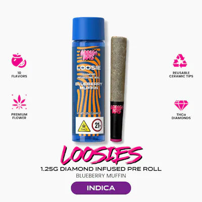 INDICA Treat yourself to the cozy sweetness of Blueberry Muffin Loosies, a rich and flavorful blend inspired by the taste of freshly baked blueberry goodness. Each Loosie is meticulously crafted with 1.25 grams of premium flower, infused with diamonds, and coated with Bodega Boyz THCA diamonds, delivering a smooth and terpene rich experience with every puff. The juicy flavor of ripe blueberries is paired with soft bakery like notes for a profile that feels warm, sweet, and satisfying from start to finish. Whether you are slowing things down or simply enjoying the moment, Blueberry Muffin Loosies offer a flavorful escape that feels both comforting and elevated. Reusable ceramic tips make this experience hit different.