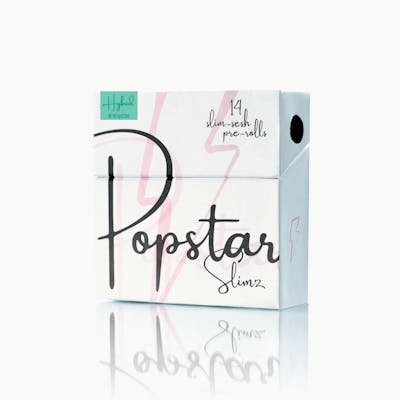 Introducing Popstar Slimz: Fourteen sleek, 0.4g pre-rolls perfect for discreet enjoyment. These "dog walker" style pre-rolls are rolled with premium nugs, not stuffed with trim, and feature all-natural biodegradable filters. Housed in a stylish, reusable flip-top box with custom matches inside, each pre-roll is sealed for freshness. No cones, just pure quality.