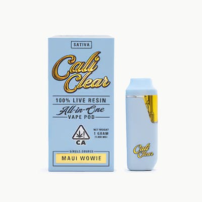 The Cali Clear AIO Live Resin Maui Wowie is a sativa-dominant disposable vape pen known for its tropical pineapple flavor and energizing, euphoric effects, designed for convenient daytime use. It typically contains 1 gram of live resin and is available from various licensed dispensaries and online cannabis retailers in legal US states, such as California.