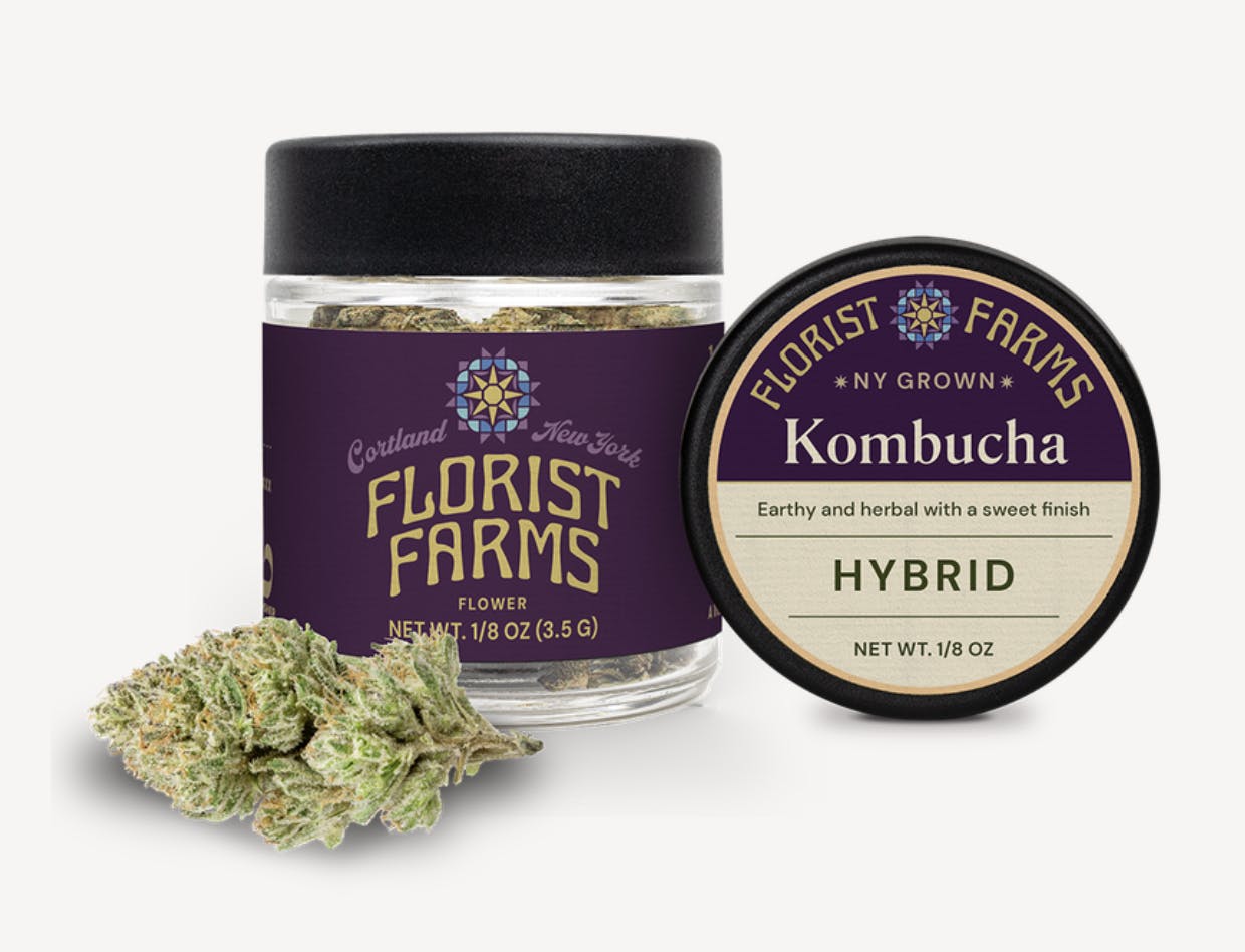 Kombucha | Hybrid | EighthAbout This ProductThis eighth of Florist Farms flower is hand-trimmed and sustainably grown in greenhouses with living soil at their farm in Cortland, New York. Whether you're rolling up or packing a bowl, expect a smooth, consistent experience rooted in craftsmanship and integrity.Effect: HybridFlavor: Earthy and herbal with a sweet finishIngredients: 3.5 Grams of Cannabis FlowerWhy We Love Florist FarmsLocated in Cortland, NY, Florist Farms is committed to sustainability. They practice regenerative farming by growing in living soil, using organic compost, and never using pesticides. For over a decade, they have been organic vegetable farmers and donate produce weekly to help support their community. Our friends at Florist Farms are deeply committed to quality and to delivering the cleanest cannabis products in New York State.Sustainably Grown • Lab Tested • No Artificial Flavoring • No Pesticides