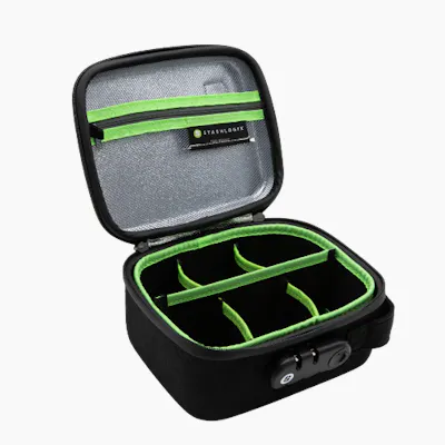 -Metal poker with stealth poker pocket -OdorPax (activated bamboo carbon) -Strain-tracking mobile phone app (replaces the previous paper Journal) -Infinitely adjustable interior divider system – can be completely removed if desired -Built-in combination lock -Exterior fabric - linen -Rubber gasket sealing system -Medium: OD 8" L x 7" W x 4 1/4” H