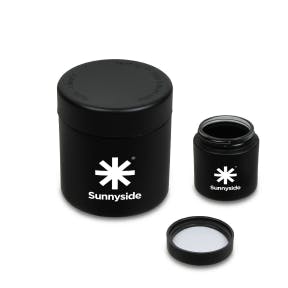 Frosted black glass jars fits up to 3.5 grams and features a child-resistant push-and-turn lid. 2.125” (W) x 2.5” (H) x 2.125” (D).