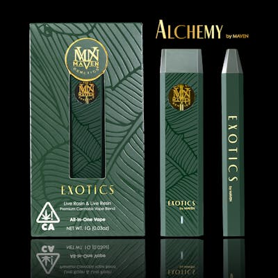 Introducing Alchemy, a premium All-in-One vape line by Maven. Inspired by the ancient art of transmutation, our master cultivators and extraction artists transformed this flower into gold. From our renowned archive of strains, we’ve crafted distinct and exceptional blends - curated from a selection of our premium Live Rosin and Live Resin. Exotics express rare, extraordinary flavors that are truly one-of-a-kind, much like the pristine, luscious fruits from an untouched island paradise. This masterfully crafted blend showcases Maven’s most innovative strains, offering intriguing, woodsy notes of tree fruit and exotic flora.