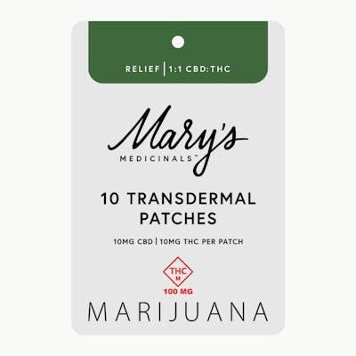 Mary's 10 Pack Patches Mary’s award-winning Transdermal Patches are now available in a 10-pack for everyday self-care. Each 10-pack of Mary's Patches contains 2x2" squares that simply adhere to any veinous part of the skin, providing 8-12 hours of discreet systemic relief. Relief (1:1) Patch: Our Relief Transdermal Patch, with a 1:1 CBD:THC ratio, is designed to promote relief from common aches and pains in your daily life. Our Everyday Relief products are formulated with natural ingredients that provide systemic relief from daily stressors. Winner of the 2023 Michigan and SoCal High Times Cups, Mary’s Medicinals Relief Transdermal Patch is sure to be a winner in your book as well.