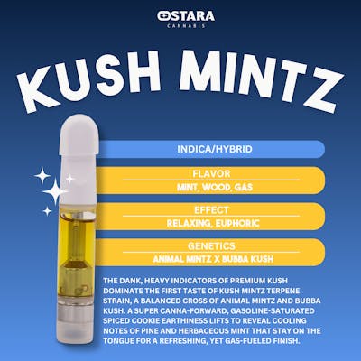 The dank, heavy indicators of premium kush dominate the first taste of Kush Mintz strain, a balanced cross of Animal Mintz and Bubba Kush. A super canna-forward, gasoline-saturated spiced cookie earthiness lifts to reveal cooling notes of pine and herbaceous mint that stay on the tongue for a refreshing, yet gas-fueled finish.