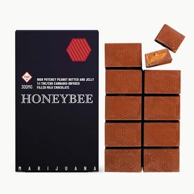 Close your eyes, take a bite, and relive your favorite childhood memories. Strawberry jelly-infused milk chocolate surrounds a smooth peanut butter center. You can try to resist, but we know you can't.\n300mg THC / 300mg CBD per package