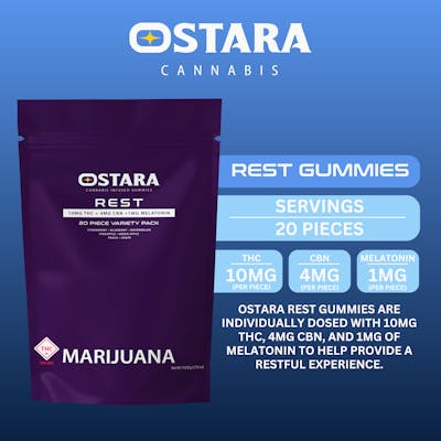 Ostara Rest Gummies are individually dosed with 10mg THC, 4mg CBN, and 1mg of melatonin to help provide a restful experience for users.