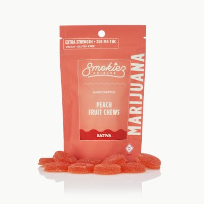 Smokiez SATIVA Peach Fruit Chews are NOT YOUR AVERAGE GUMMY. These delicious Fruit Chews are a tasty and satisfying way for your customers to medicate! They are also Vegan, Gluten-Free, Dairy-Free, and contain NO High Fructose Corn Syrup. Each of our mouth-watering Fruit Chews contains 25 mg of THC, and is made with our high clarity cannabis distillate for great taste. There are 10 pieces per package with 250 mg active THC per package. Smokiez Fruit Chews come in 5 delicious flavors and have both sweet and sour flavor profiles that your customers are sure to love!