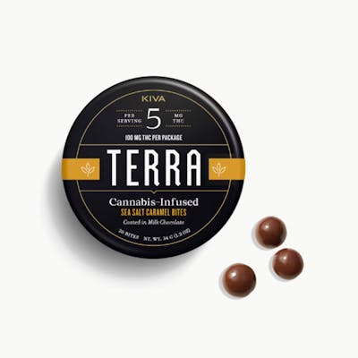 Sea Salt Caramel Terra Bites boast delicious, rich and smooth caramel centers coated in creamy milk chocolate and sprinkled with Pacific sea salt. These bites have a sweet, buttery flavor that finish with a salty kick. -- Ingredients: Milk Chocolate (Sugar, Cocoa Butter, Milk, Cocoa Mass, Sunflower Lecithin, Vanilla), Tapioca Syrup, Sugar, Cream (Milk), Palm Kernel Oil, Sea Salt, Gum Arabic, Cannabis Extract, Natural Flavors, Confectioner's Glaze, Sucrose, Glucose Syrup. -- Allergy Warning: Contains milk. May contain nuts, soy and gluten.