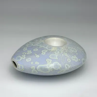 Slipcast, vitreous white stoneware pipe with crystalline glaze exterior and glossy white liner glaze. Hollow form allows for large volume of smoke and smooth, wide shape is comfortable in the palm and stable on surfaces. Simple design allows for easy cleaning. 4” l x 3.5” w x 1 3/8” h Care: Clean as you would any glass pipe; soaking in isopropyl alcohol and scrubbing with a pipe cleaner is very effective. Please note, that while ceramic is very strong, it is not on the level of borosilicate glass, and will break if dropped from a height onto a hard surface. Treat as you would a beloved piece of functional pottery and it will serve you indefinitely.
