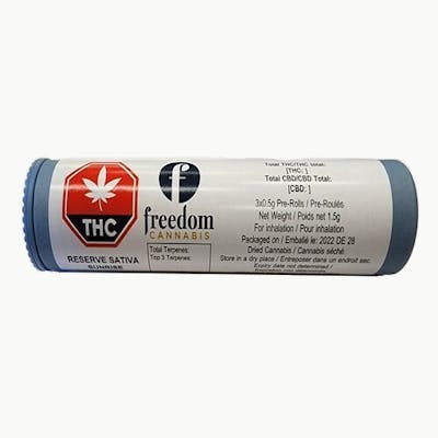 Freedom Cannabis Reserve Sunrise pre-rolls contain only Freedom's best buds. These cone-style pre-rolls are made from quality, high-THC, craft cannabis with only the top 10% of buds making the grade to be used in Freedom's reserve line. This sativa-dominant strain (Freedom's Luminate Product Line) features buds with THC levels between 25-31% that their team has pampered to ensure perfection.