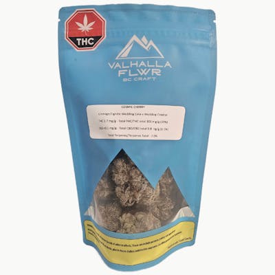 Award-winning, never-irradiated craft from legacy genetics made from Wedding Cake and Wedding Crasher. Cultivated indoors in small batches with LED lighting in coco medium, it’s hang-dried, hand-trimmed, and cured to perfection. This flower features dense green buds with purple undertones, covered in trichomes. Enjoy its earthy, herbal aroma and cherry flavour that defines “Cosmic Cherry.” Terpenes include cedrene, humulene, and carene.