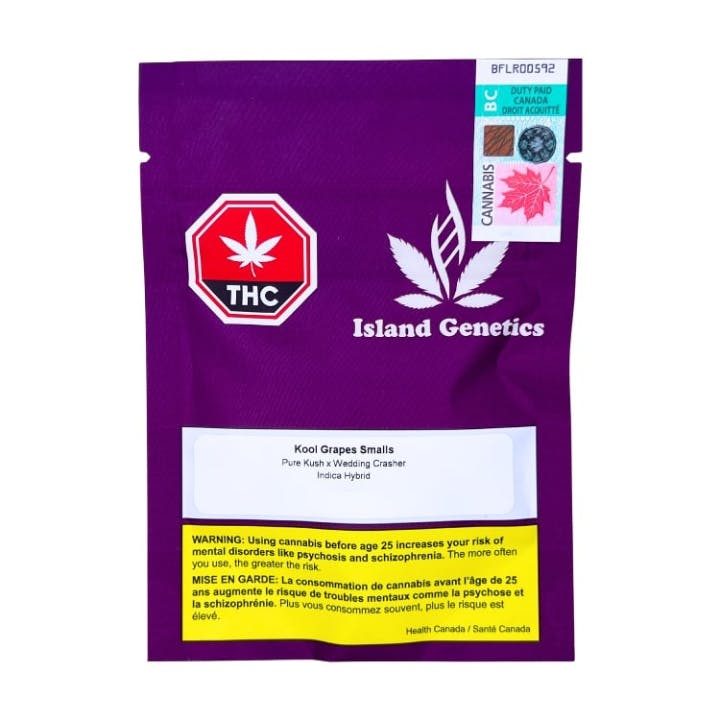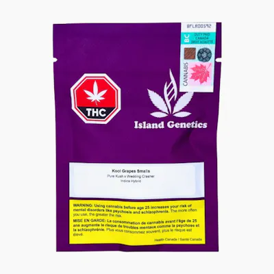 Kool Grapes is an indica dominat hybrid with an old school sweet kush with a hint of earth and a menthol gas profile. It's a cross between Pure Kush and Wedding Crasher. The flower is grown indoors at a purpose built in-door facility on Vancouver Island in organic living soil. Full plant hang dried for 2 weeks, hand trimmed and cured for a minimum of 2 more weeks in Terp Lock bags. Smalls buds are 2cm and under.