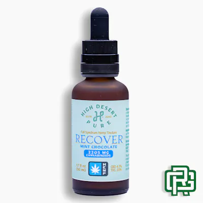 1:75 THC:CBD | Flavor: Mint Chocolate | "Recover" is a 50mL hemp-derived gentle elixir. 1 dose = 1mL dropper with the whole bottle having 50 servings. | 44mg CBD/serving | 2240mg CBD/container | Average Activation Time: 40 minutes (can take up to 2 hours) | 2390mg Total Active Cannabinoids (TAC)