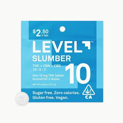 Struggling to find a natural and effective way to unwind and get a good night’s sleep? Then forget sugary gummies and late-night snacks and try LEVEL 10 Slumber. We’ve combined the power of 10 mg of delta-9 THC, 5 mg of CBN, and 3 mg CBG in a carefully balanced formula designed to gently lull you into a state of relaxation and promote restful sleep. These highly effective, long-lasting tablets are sugar-free, gluten- free, vegan, and contain zero calories. They’re scored for easy splitting so you can customize your dose to find the perfect level of tranquility. Simply swallow with liquid. DCC-10004472