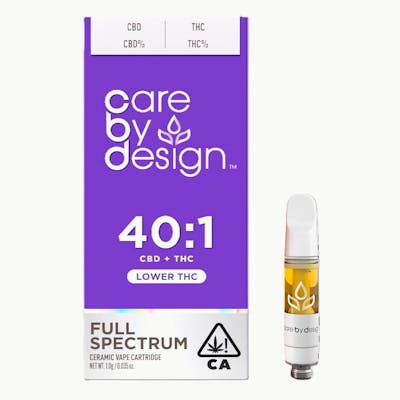 Care by Design's 40:1 cartridge is made from high quality strains grown in the California sun and extracted using a unique method that captures the full array of cannabinoids, terpenes, and other bioactive compounds. This ratio produces a clear-minded effect suitable for beginners and others looking for relaxation without psychoactivity. Works with a standard 510 battery. From California-based Care by Design. An empty integrated cannabis vaporizer shall be properly disposed of as hazardous waste at a household hazardous waste collection facility or other approved facility. A spent cannabis cartridge shall be properly disposed of as hazardous waste at a household hazardous waste collection facility or other approved facility. CDPH - 10002270