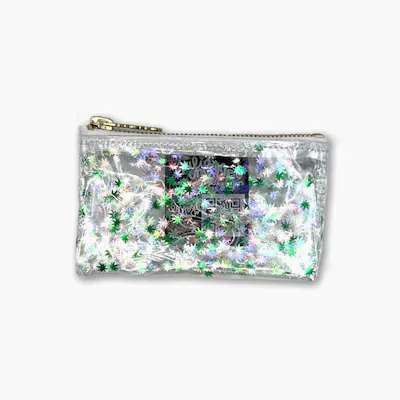 Spark Some Sparkle with the High Holidaze Kush Klutch! Spark some sparkle! This Kush Klutch is serving HIGH holidaze! Teeny tiny holographic and green marijuana leaf confetti inside a clear vinyl midi clutch is perfect for holding all of your weed money, one-hitters, rolling papers, and more!