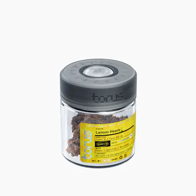 Lemon Heads (Lemon G x Face Off OG) is bursting with sharp citrus aroma, diesel-like lemon gas, and soft herbal notes. The inhale is zesty and refreshing, while the exhale leaves a crisp, tangy finish. Ideal for social creativity or energized afternoons, Limonene drives its citrusy kick. Every Torus Culture strain is grown in limited batches using proprietary deep water culture hydroponics, then processed in-house and hand-trimmed to preserve its natural character. Each harvest is unique — alive with fresh terpene expression, tended by hand at every stage to bring out its best flavor and aroma.