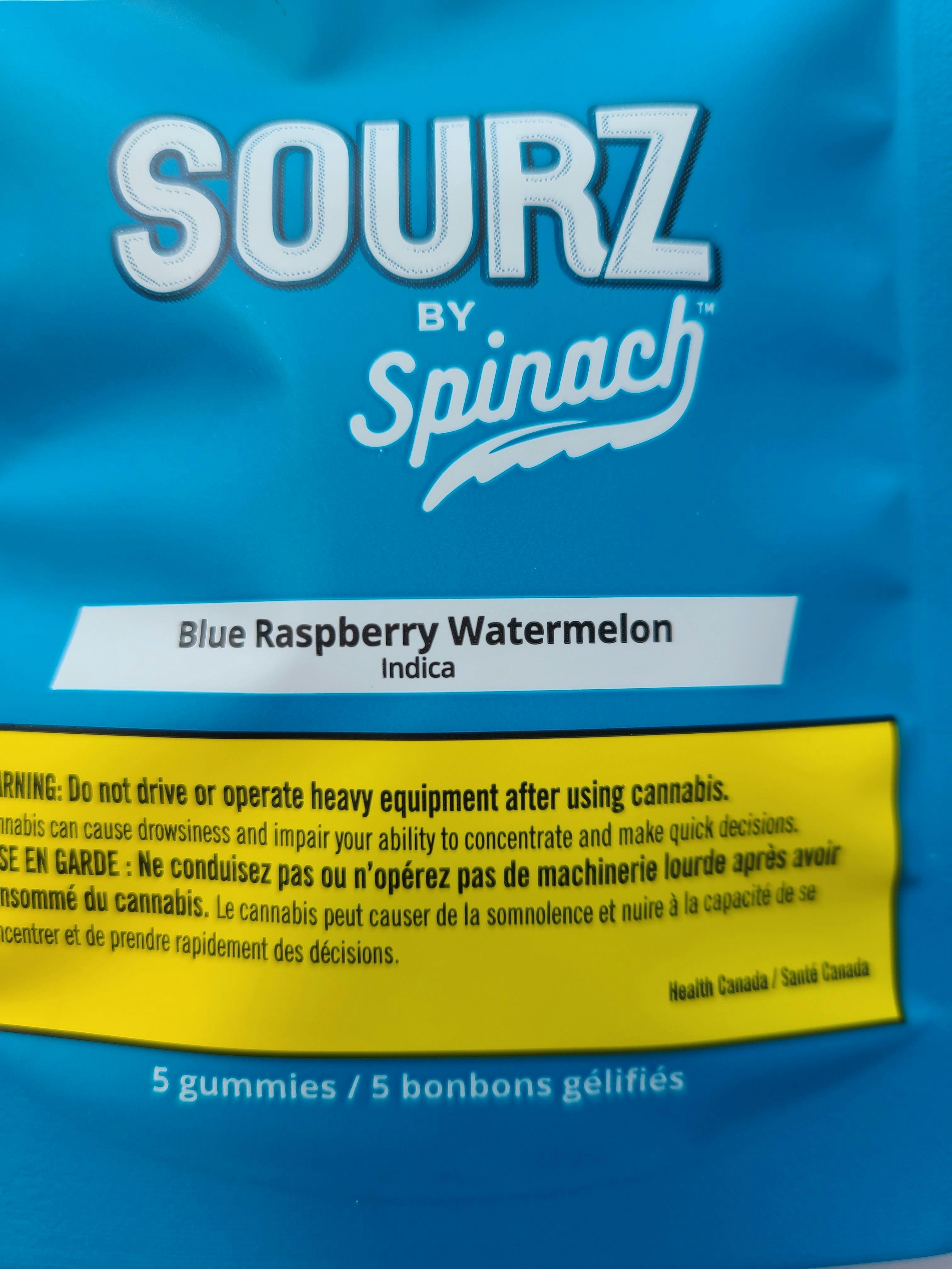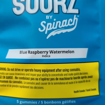 Enjoy the electrifying and refreshing flavours of blue raspberry and watermelon. These SOURZ by Spinachâ„¢ have 5 pieces/pack and 10mg of THC total.