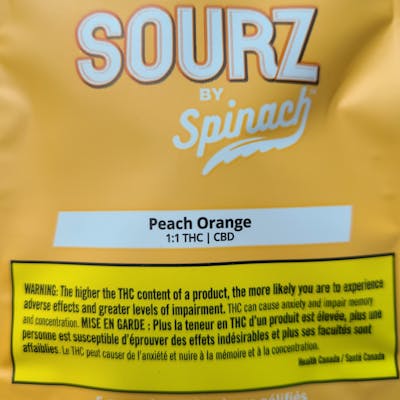 Smash a juicy peach into a succulent orange. The result? SOURZ by Spinachâ„¢ with 5 pieces/pack and 10mg THC total and 10mg CBD total.