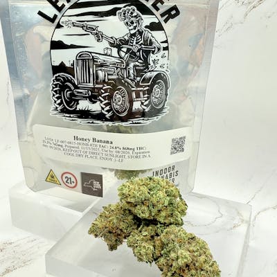 Honey Bananas is an evenly balanced hybrid (50% indica/50% sativa) strain created through a cross of the rare Strawberry Banana X Honey Boo Boo strains. This rare bud is beloved for its insanely delicious flavor and its relatively mellow effects. Much like its name suggests, Honey Bananas has a super sweet flavor of tree fruit, bananas, and honey with a sugary candy aftertaste that intensifies upon exhale. The aroma is very fruity, with an earthy pungency that has a super sweet effect that's released as the nugs are broken apart. Honey Bananas has effects that are very well balanced in nature and are ideal for later in the day. The high starts with a euphoric uplifted state that leaves you slightly energized with a mild sense of artistic motivation. As the high builds, it will become very hazy, leaving you sedated and very sleepy with a building case of the munchies. These effects make Honey Bananas the perfect bud for treating conditions such as insomnia, chronic fatigue, mild cases of depression, chronic stress or anxiety, and headaches or migraines. This bud has large and dense bright neon green spade-shaped nugs with light amber hairs and a super sticky coating of sweet syrupy resin.