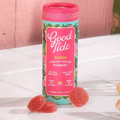 Take a tropical plunge with Good Tide guava gummies.Infused with rosin extracted from hybrid cannabis strains, our guava gummies offer a balanced high with true-to-plant properties. The naturally occurring terpenes and minor cannabinoids present in our solventless hash rosin combine with the real- fruit guava ingredients to create a deliciously rounded experience.