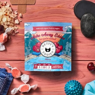 All -Natural Stress Pain Relief. Enjoy a piece of peace with our Take it Easy Eddies. These very cherry Ache Away Eddies are infused with a soothing blend of CBD, CBC & THC, plus a natural blend of turmeric, piperine, and vitamin E that may help ease inflammation and aid recovery. Betty knows best, eat your Eddies!