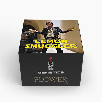 Lemon Smuggler is an indica-dominant hybrid strain bred by Happy Valley Genetics by crossing Han Solo Burger with Super Lemon Haze #119. It is known for its high potency, with THC levels frequently testing between 24% and 37%. The strain features dense, trichome-heavy buds with a complex aroma of spicy, garlic-citrus, and skunk, offering a relaxing, "couch-lock" experience.
